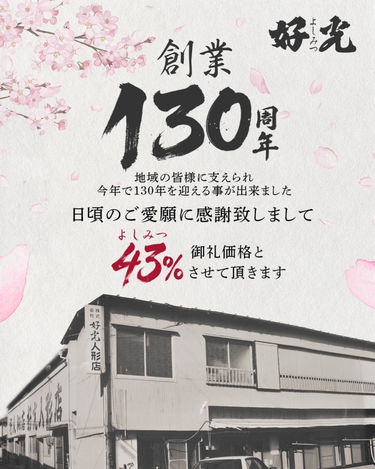 創業130周年を迎えた好光人形店。長年のご愛顧に感謝申し上げます。